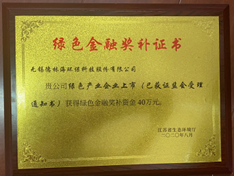 喜訊:我司榮獲江蘇省生態環境廳綠色金融獎補資金